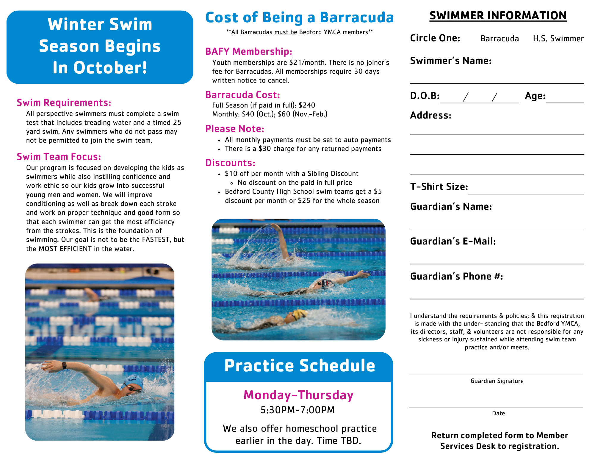 Swimmers must be active members to be on the team, and we offer different options for that. A Youth membership is $21 per month when drafted monthly. There are invoice options for 3, 6, and 12 months but additional fees will apply. There will be no Joiner’s Fee if you are joining the swim team but we do have a 30-day notice to cancel policy that will apply as well as a membership maintenance fee.